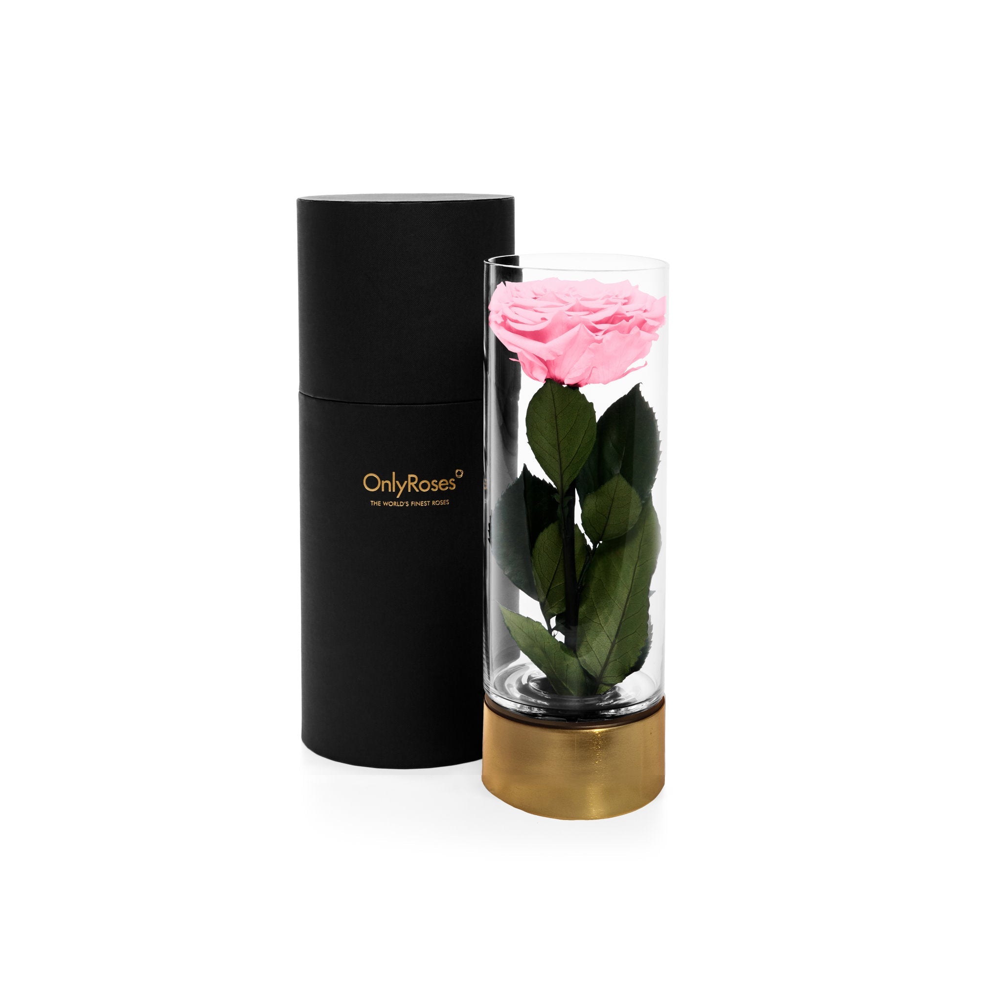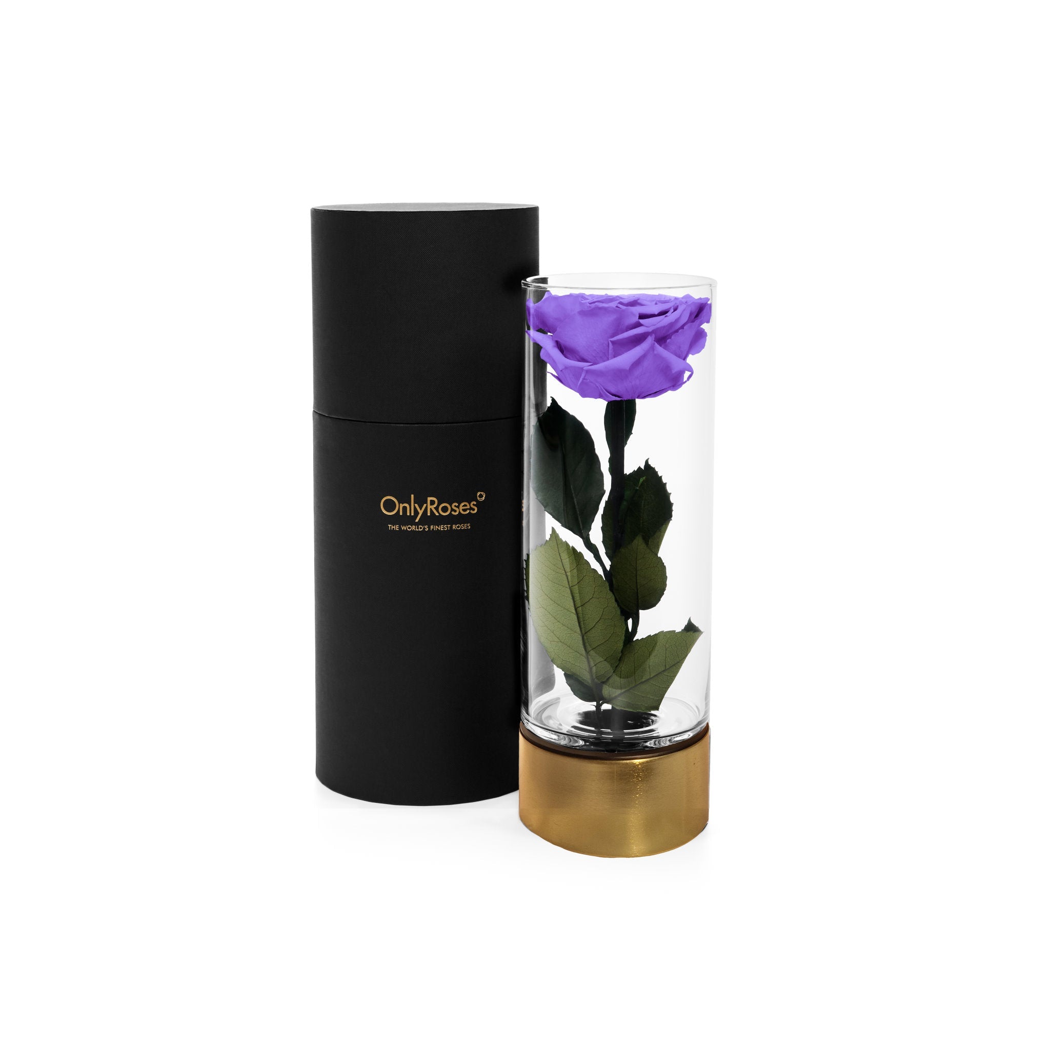A single long-stemmed Infinite Rose presented in a clear glass vase with a brass base and luxury presentation box - poised and timeless. Hand-crafted to order, Ebony is a graceful note for a dressing table, a writing desk, or a bedside pedestal.