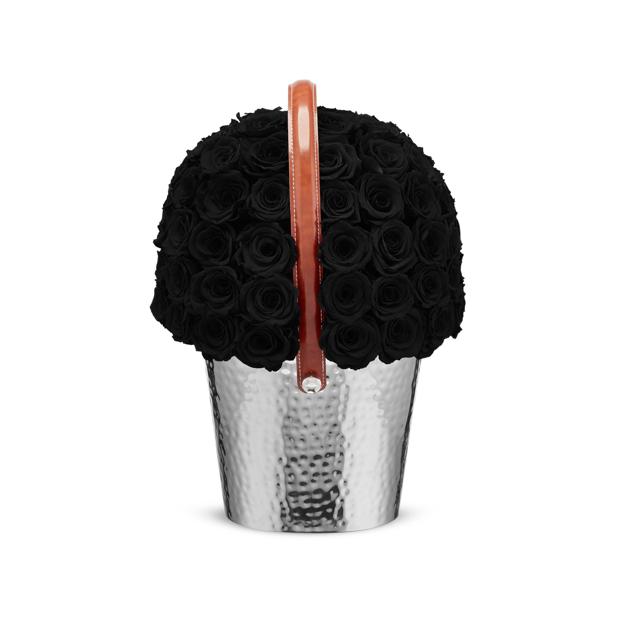 A dome of Infinite Roses arranged around a leather handle within a champagne cooler–style vase of stainless steel. Hand-made to order, it transitions elegantly from pre-dinner drinks to formal dining - equally at home on a marble bar, buffet console, or centre table.