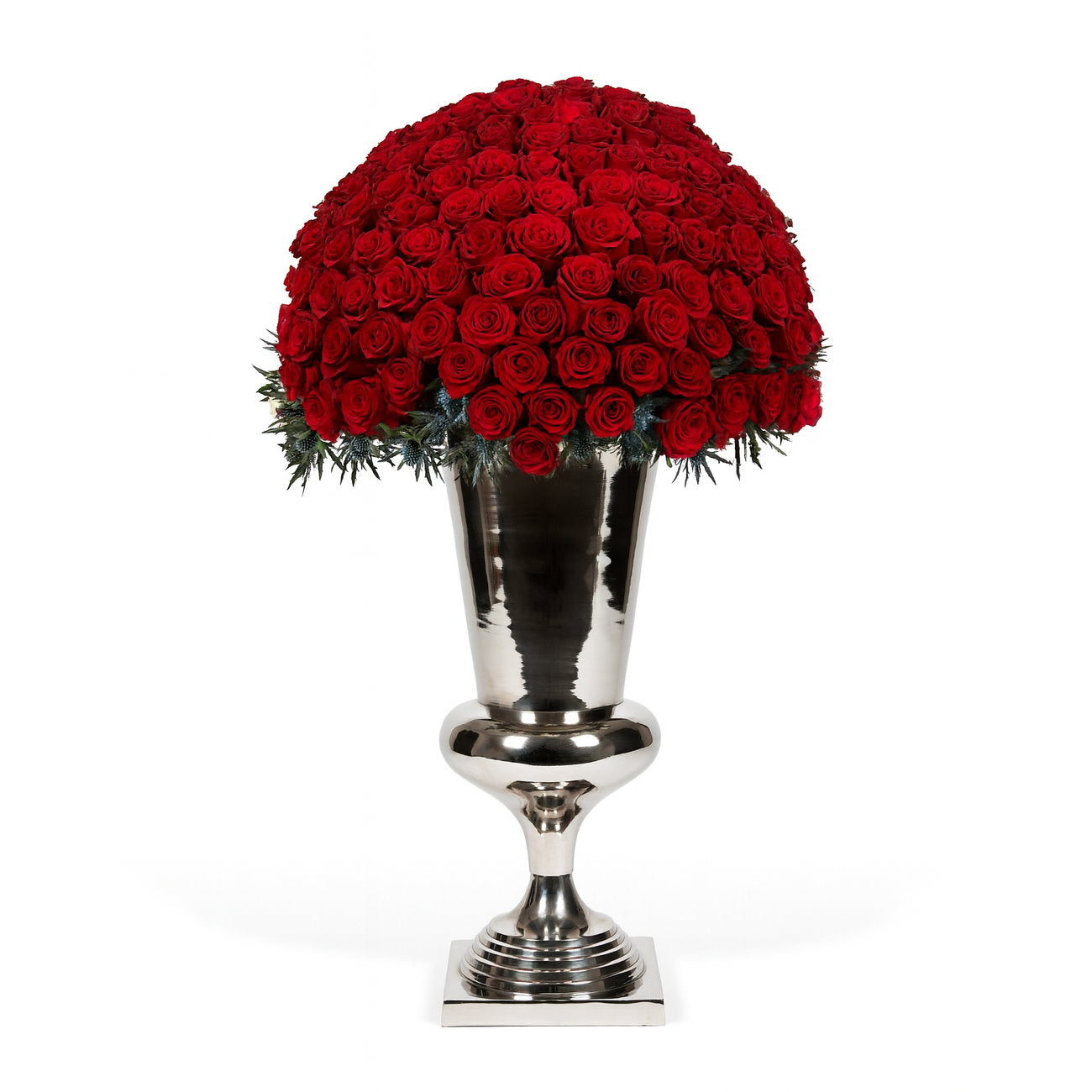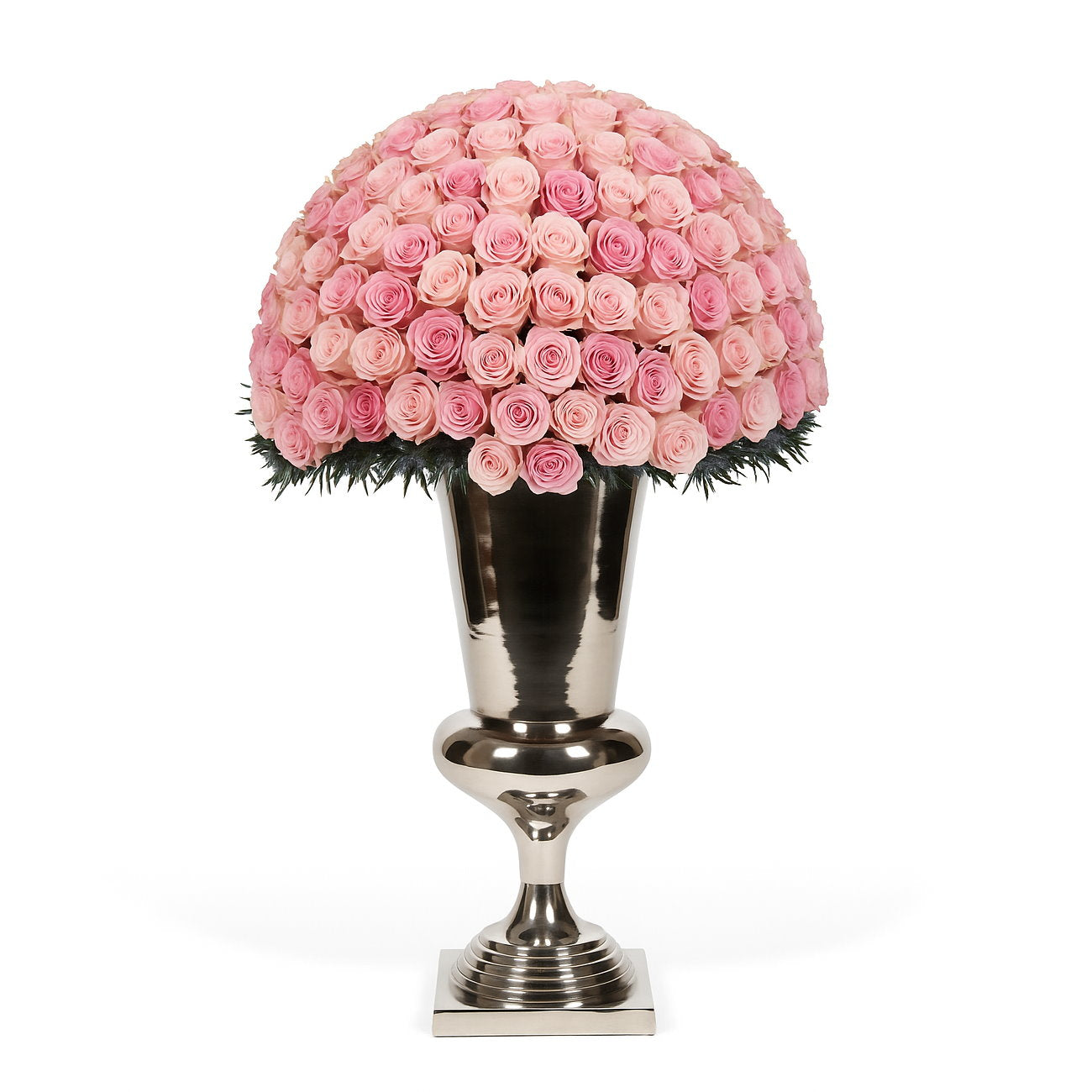 The Coliseum is an architectural composition of Classic Roses presented in a stainless-steel urn - hand-assembled by two experienced florists when required. It is destined for grand foyers, stairway landings, and formal salons where scale and symmetry elevate the space.